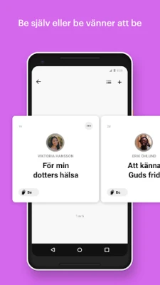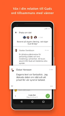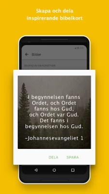 Fördjupa din tro tillsammans med andra genom Bibelappens engagerande gemenskapsfunktioner. Dela ärliga samtal om tro, upptäckter och insikter från skriften med vänner. Följ dina vänners andliga resor genom att se deras bokmärken och markeringar i ditt flöde, och fördjupa er tillsammans genom att kommentera bibeltexter. Skapa inspirerande bibelordsbilder med dina favoritverser eller integrera dem i egna foton för att enkelt sprida budskapet. Utforska tusentals andakter och läsplaner som guidar dig genom specifika ämnen eller hela Bibeln, kompletterat med videor som ger ytterligare insikt. Ljudbiblar berikar din upplevelse, så att du kan lyssna på Guds Ord även när du är på språng.