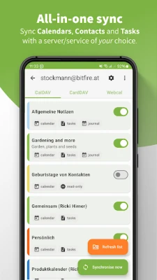 DAVx5 erbjuder robust och säker synkronisering för dina kontakter (CardDAV), kalendrar (CalDAV) och uppgifter (WebDAV Task). Håll enkelt din personliga och professionella data konsekvent över alla dina Android-enheter och tjänster. Upplev pålitlig datahantering.
