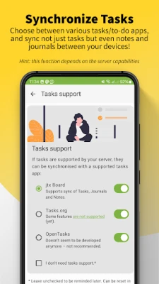 Med DAVx⁵ får du en robust tvåvägssynkronisering som säkerställer att dina data alltid är uppdaterade, både på din enhet och på din server. Utöver kalendrar, kontakter och uppgifter, ger appen dig även möjlighet att hantera och få tillgång till dina WebDAV-filer, som om de vore lokala på din enhet. Dessutom är kompatibiliteten oöverträffad; DAVx⁵ fungerar smidigt med i princip alla CalDAV- och CardDAV-servrar och -tjänster, inklusive populära plattformar som Nextcloud, iCloud och Synology. För dig som använder jtxBoard för att hålla reda på anteckningar och dagböcker, erbjuder DAVx⁵ en fantastisk synergi genom att synkronisera dess innehåll direkt med din egen server.