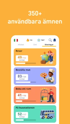 Oavsett om dina ambitioner är professionella, personliga eller kopplade till resor, anpassar FunEasyLearn sitt innehåll för att möta dina specifika behov. Utforska skräddarsydd italienska för affärsvärlden, perfekt för yrkesverksamma inom service och handel, eller dyk in i praktiska fraser för att boka boende, beställa mat och navigera smidigt under resan. FunEasyLearn är lämplig för alla åldrar, från vuxna till barn, och gör inlärningen både rolig och givande. Genom att spela de interaktiva spelen i FunEasyLearn kan du tjäna "blommor" som låser upp nytt innehåll, vilket gör din språkupplevelse både dynamisk och kostnadsfri att påbörja.