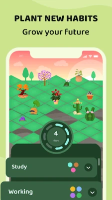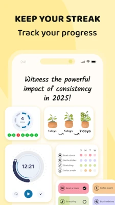 Med varje ny vana du påbörjar sätter du ner ett litet frö i din personliga trädgård. Denna unika process motiverar dig att hålla fast vid dina åtaganden, dag efter dag. Varje gång du slutför en vana, ser du din "Streak" växa sig starkare, vilket symboliserar din obrutna kedja av framsteg. Dessutom får du se hur din egen digitala planta frodas och blir större i takt med din konsekventa insats. För att säkerställa att du aldrig missar ett viktigt steg på vägen, får du dessutom påminnelser som varsamt guidar dig genom din dagliga rutin.